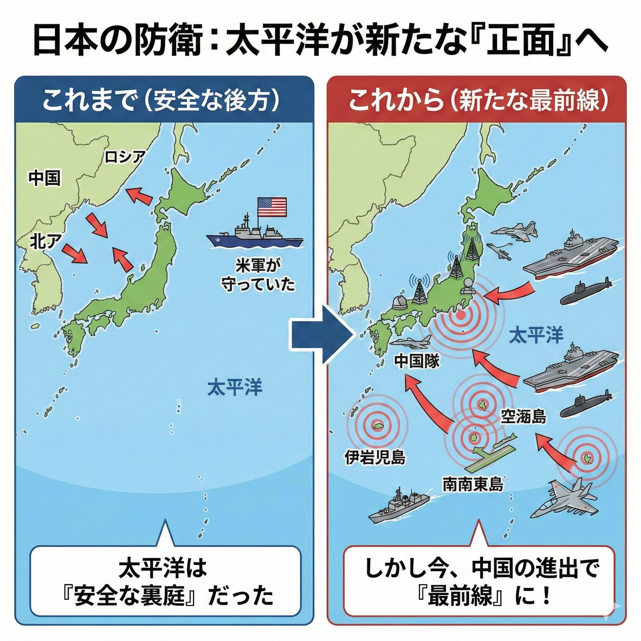 これまで日本の防衛は、北(ロシア)、西(中国・北朝鮮)に集中していました。しかし、政府は2026年に向けて「太平洋側の守りの強化」を打ち出す方針です。