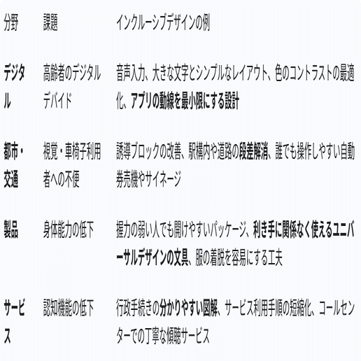 高齢化と人口減少という、日本が直面する構造的な課題を解決し、持続可能な社会を築く上で、インクルーシブデザインは中心的な役割を果たします。